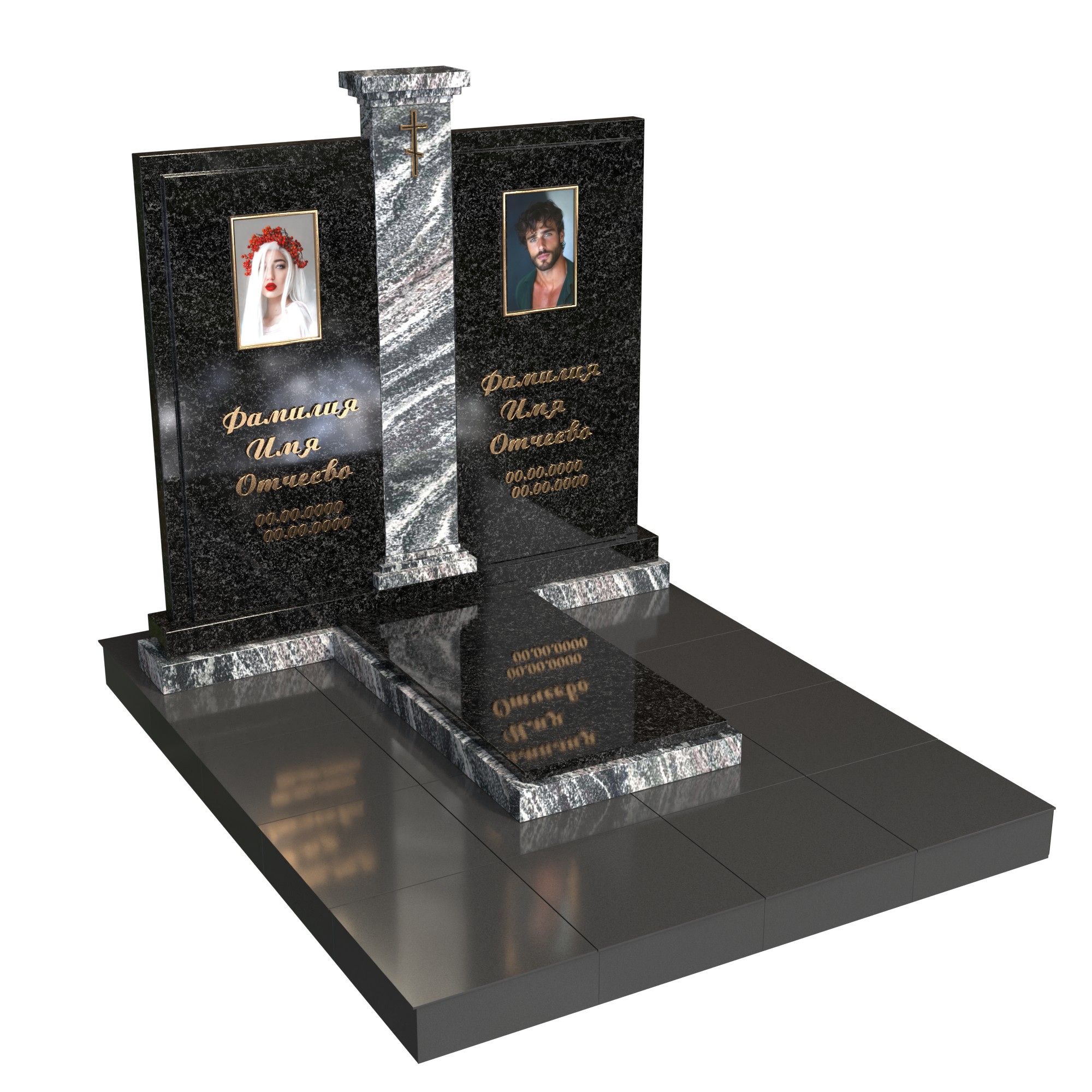 Памятник «Арочная классика» — элегантная модель из натурального камня с высокой арочной стелой. В центре — фотопортрет на стекле (крепление на метизах) и именная гравировка; сверху — аккуратный крест. Двухуровневая надгробная плита с контрастной вставкой подчёркивает строгую геометрию. Композицию дополняют цилиндрическая ваза и лампада, формируя ухоженный, торжественный вид участка.