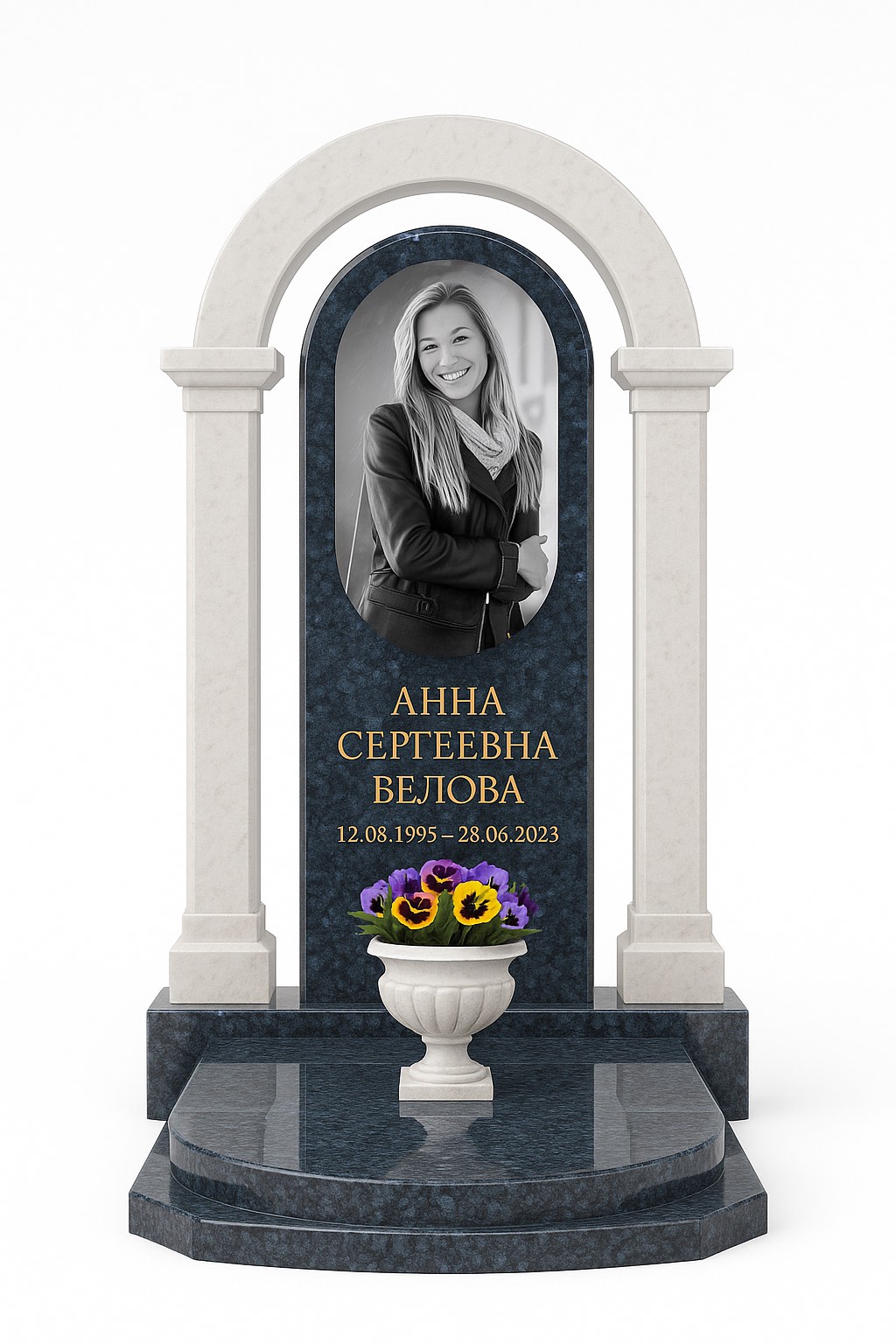 Современный арочный памятник выполнен в премиальном сочетании белоснежного мрамора Коелга с серыми прожилками и насыщенного норвежского гранита Блю Перл с выразительными сине-голубыми отблесками.