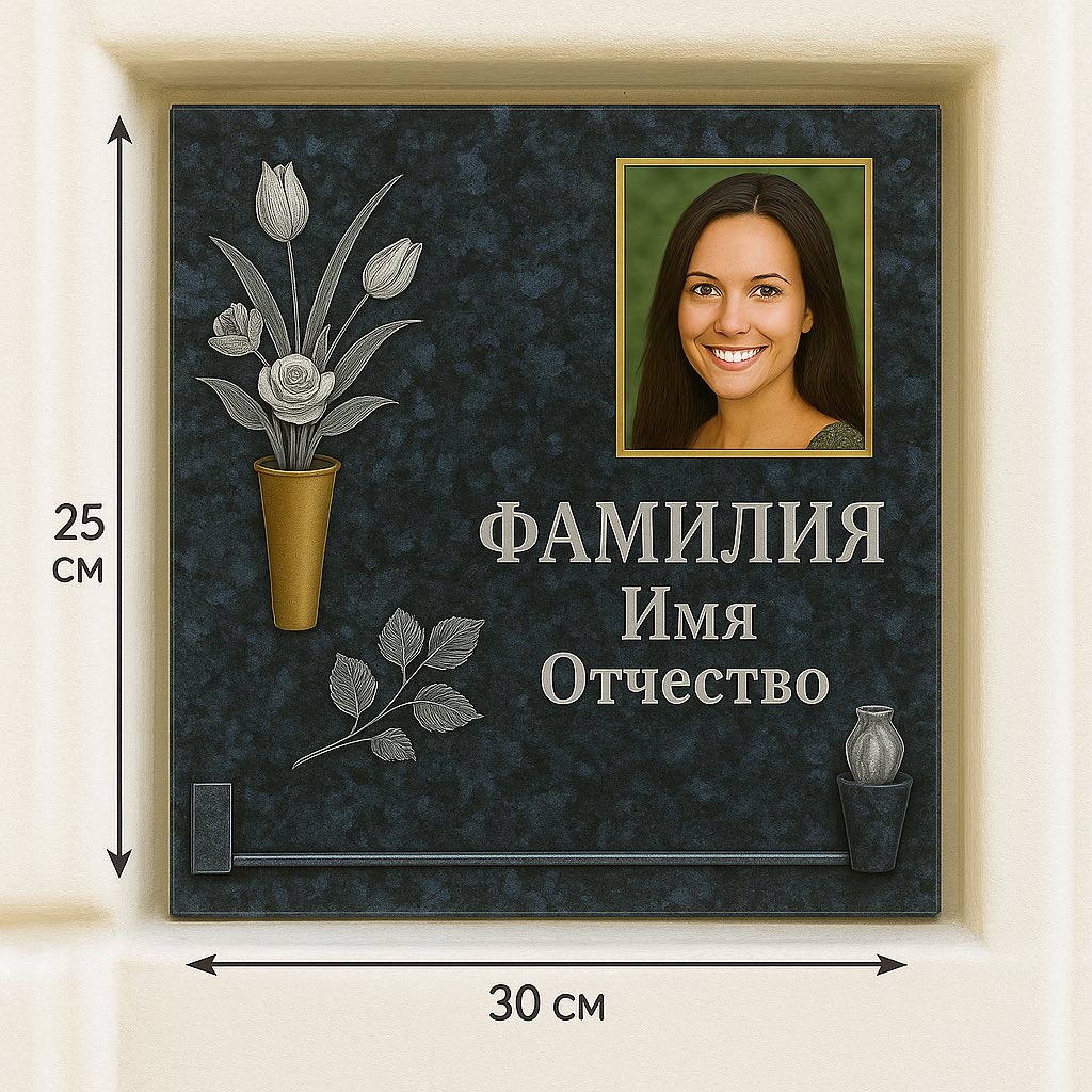 Эта модель предназначена для установки в колумбарную нишу и выполнена из натурального гранита Blue Pearl с выразительной сине-серой текстурой. Поверхность оформлена гравировкой: цветочным орнаментом, декоративной веткой и имитацией надписи с ФИО. Портрет может быть выполнен на керамике или фотостекле. Композиция дополнена аксессуарами (каджати) — изящной лампадой и вазой.