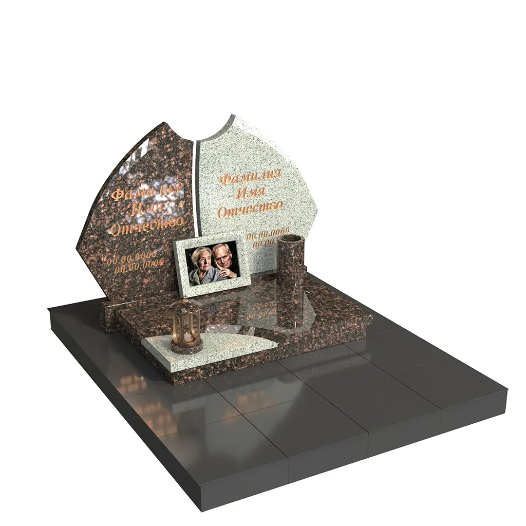 Контрастное сочетание благородных пород гранита подчеркивает индивидуальность каждого, а общее основание объединяет их в вечном союзе. На горизонтальной плите предусмотрено место для фоторамки с изображением пары — как напоминание о нежности и жизненном пути, пройденном вместе.
