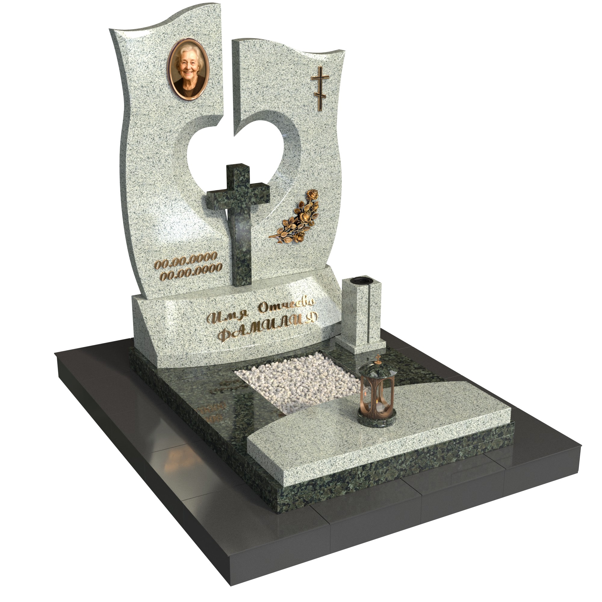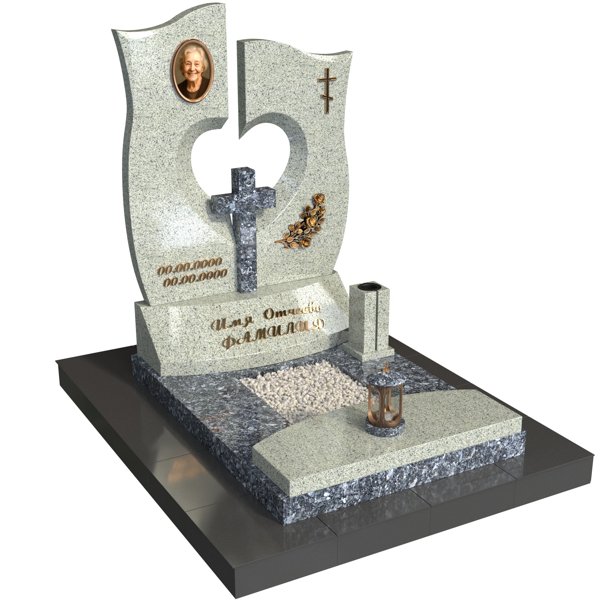Памятник «Сердце веры» — выразительная модель из натурального камня с фигурной стелой и сквозным вырезом в форме сердца. В центре композиции — аккуратный каменный крест, слева овальный фотопортрет, рядом изящный декоративный элемент. Двухуровневое основание с цветником из крошки, лампада и каменная ваза создают ухоженный и торжественный вид участка.