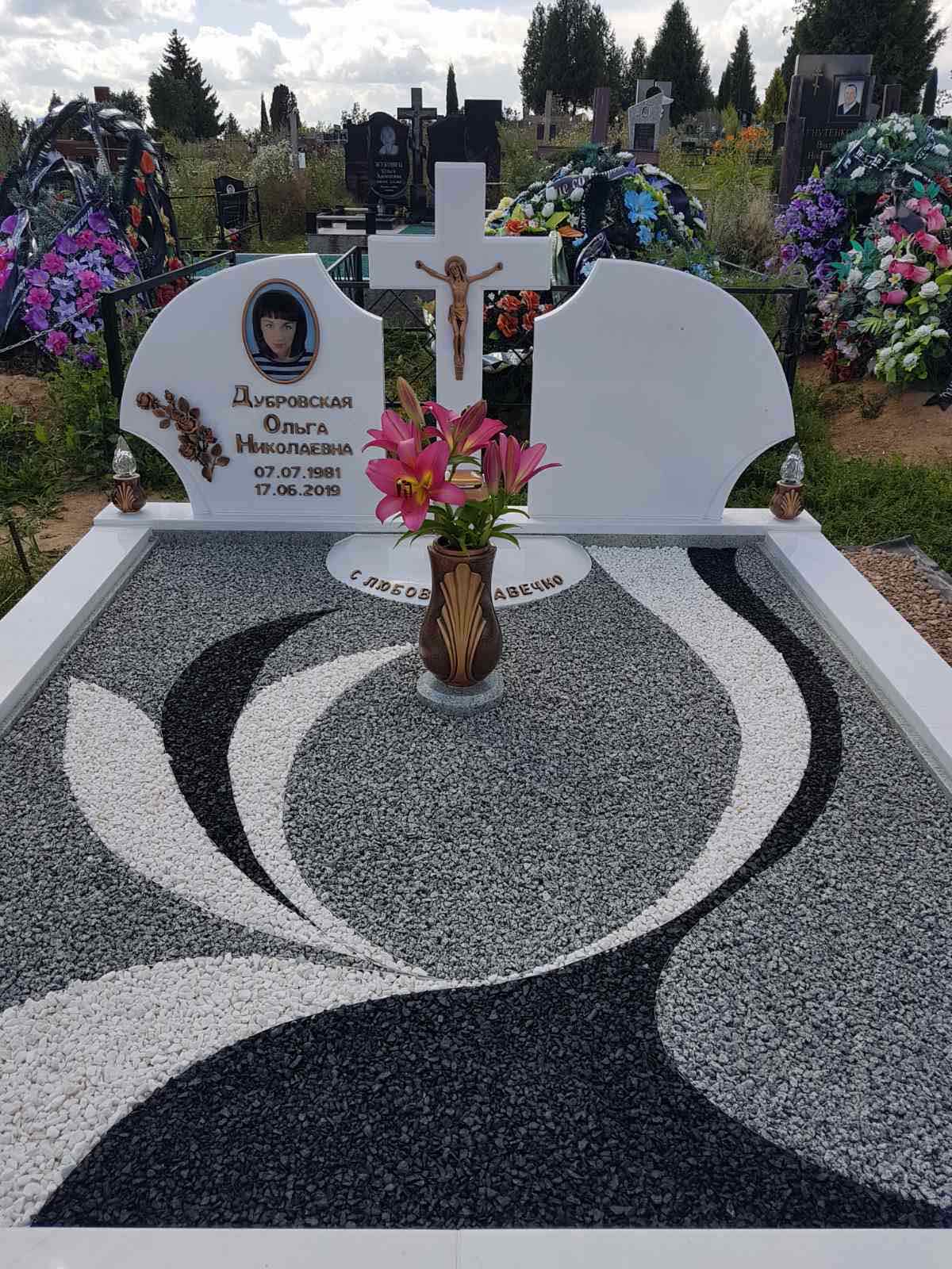В центре композиции — изогнутая стела с овальным керамическим фотомедальоном, оформленная декоративной бронзовой розой и надписью из бронзы Caggiati — всемирно признанного итальянского бренда в сфере ритуальной бронзы. Композиция дополнена массивным мраморным крестом, также украшенным распятием Caggiati, что подчёркивает духовную значимость и утончённость оформления.