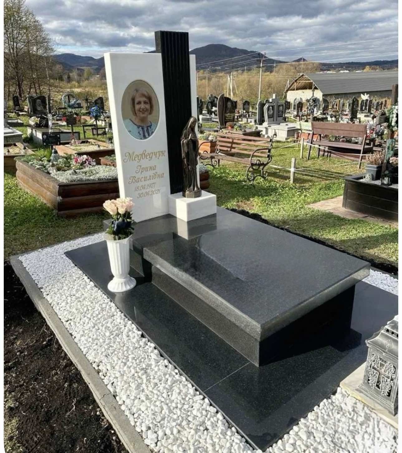 Эта элегантная модель сочетает светлый мрамор и чёрный гранит, создавая выразительный и гармоничный образ. Вертикальная стела из белоснежного мрамора украшена портретом на фарфоре, золотой надписью и декоративной бронзовой скульптурой. Основание выполнено из прочного гранита Габбро-диабаз, устойчивого к любым погодным условиям.
